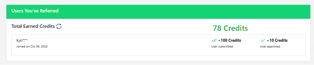 Track your referrals Users can monitor their referral activity, including the number of signups and earned credits, directly from the Referral Dashboard.